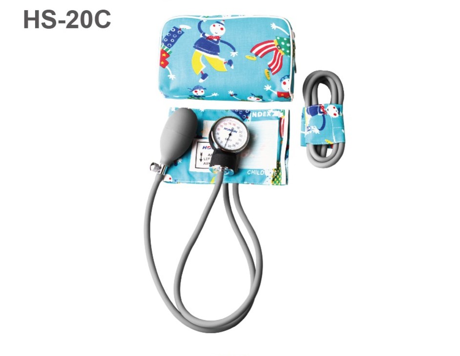 Ciśnieniomierz zegarowy dziecięcy HS-20C. Czytelny zegar w szarej metalowej główce. W zestawie trzy kolorowe mankiety w różnych rozmiarach noworodków, niemowląt i małych dzieci. Szara gruszka metalowy zawór kolorowe etui oraz instrukcja obsługi w języku polskim.