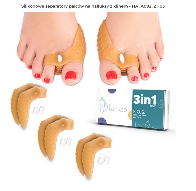Wykonane z miękkiego i elastycznego silikonu. Pomagają wyprostować koślawego palca. Są połączeniem zwykłego separatora z osłonką na haluksy. Dzięki temu nakładki lepiej trzymają się na stopie, spełniając przy tym swoje podstawowe zadania, czyli korygowanie położenia dużego palca stopy, ochrona bolącego miejsca, haluksa, przed uciskiem oraz zapobieganie zachodzeniu palców na siebie