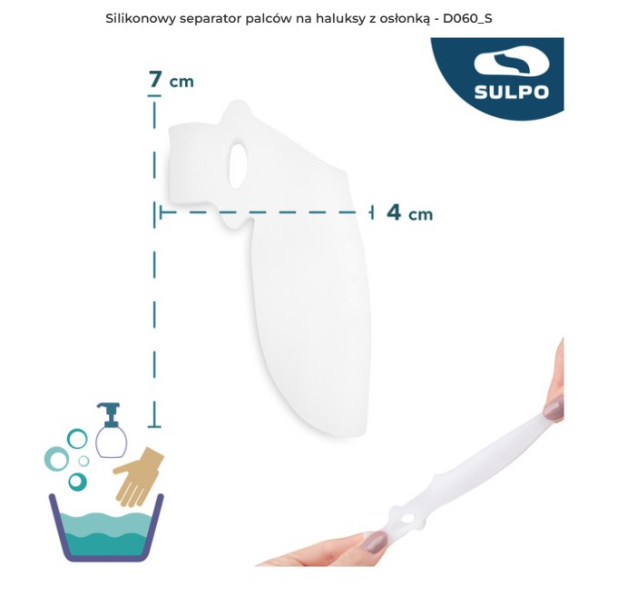 Separator jest odpowiedni do użytku przez cały dzień, zarówno w domu, jak i w pracy, podczas spacerów czy treningów. Można go nosić w obuwiu, zapewniając stopie komfort i ochronę przed otarciami. W nocy również wspiera korektę ustawienia palców, co czyni go wszechstronnym wsparciem w walce z haluksami.