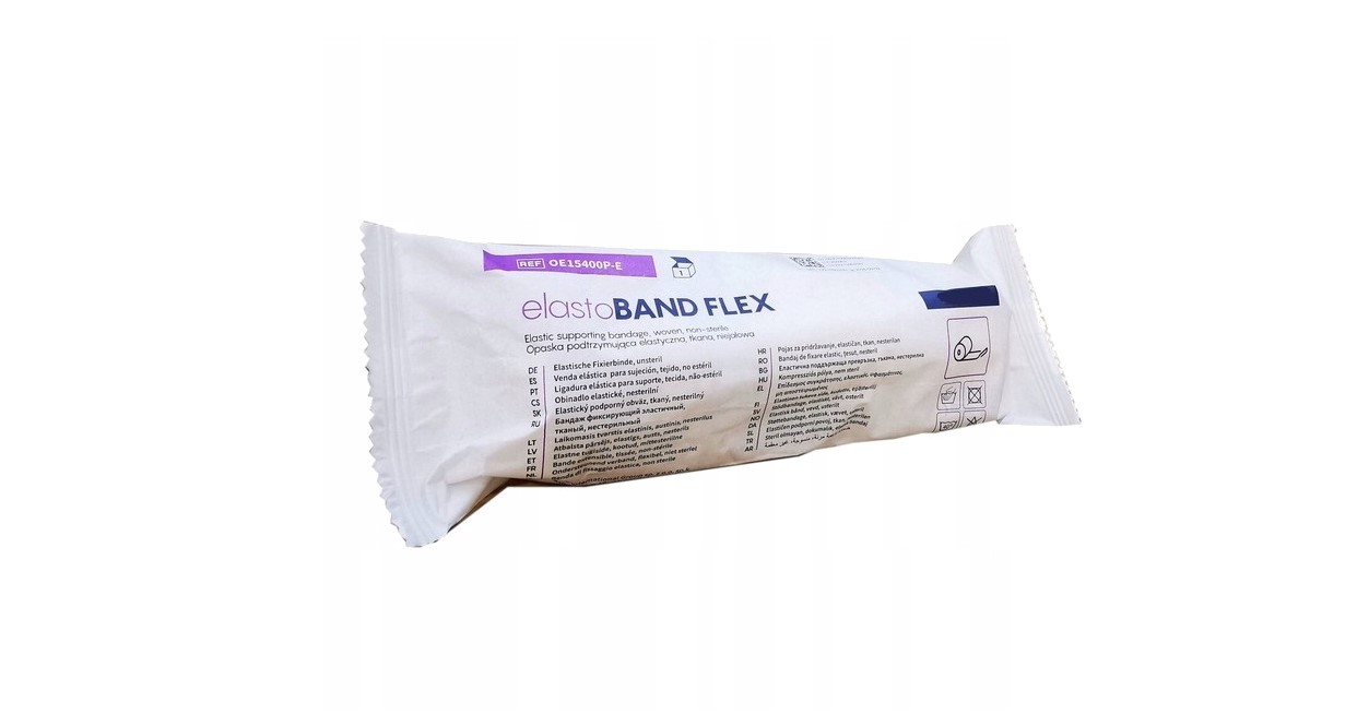 Opaska podtrzymująca elastyczna, tkana niejałowa elastoBAND FLEX przeznaczona do przytrzymywania opatrunków oraz do podtrzymywania i uciskania części ciała w celu leczenia zwichnięć i nadwyrężeń, obrzęków limfatycznych oraz wzmacniania powłok skórnych po zabiegach operacyjnych.