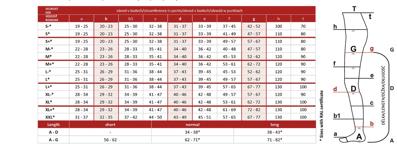 Przy doborze rozmiaru kluczowe wartości znajdują się w punkcie b (obwód powyżej kostki) i d (obwód poniżej kolana).