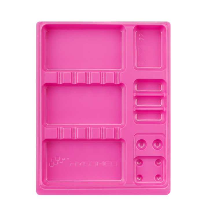 Stabilny i praktyczny box ułatwiający organizację pracy. Tacki stomatologiczne wykonane są z wysokiej jakości polistyrenu. Posiadają wygodne przegródki i profilowania na narzędzia, takie jak wiertła czy aplikatory oraz wgłębienia na płyny, wypełniania i inne materiały.