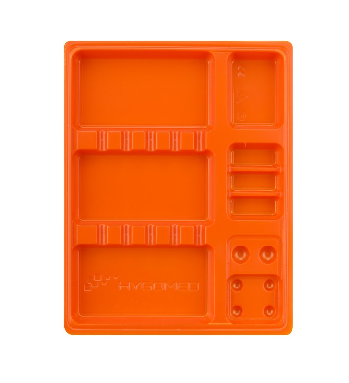 Stabilny i praktyczny box ułatwiający organizację pracy. Tacki stomatologiczne wykonane są z wysokiej jakości polistyrenu. Posiadają wygodne przegródki i profilowania na narzędzia, takie jak wiertła czy aplikatory oraz wgłębienia na płyny, wypełniania i inne materiały.