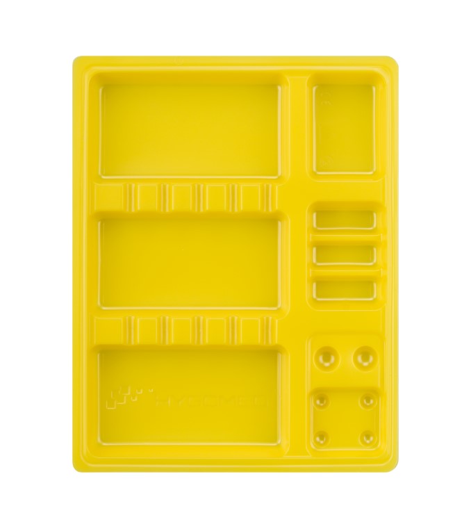 Stabilny i praktyczny box ułatwiający organizację pracy. Tacki stomatologiczne wykonane są z wysokiej jakości polistyrenu. Posiadają wygodne przegródki i profilowania na narzędzia, takie jak wiertła czy aplikatory oraz wgłębienia na płyny, wypełniania i inne materiały.