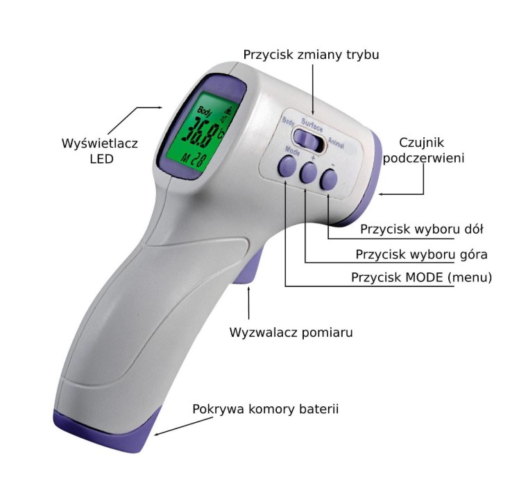 Dodatkowe funkcje i właściwości: pomiar temperatury ciała oraz temperatury powierzchni, np. pożywienia, płynów, itp.