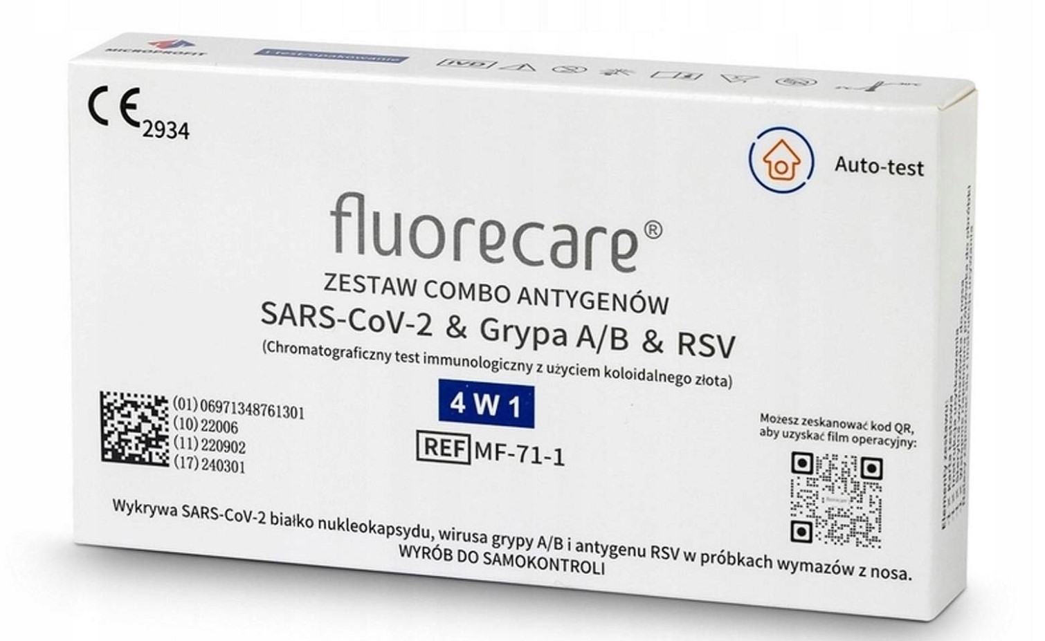 Test Fluorecare Combo 4w1 to zaawansowany test immunochromatograficzny, który umożliwia jakościowe wykrywanie antygenów białka nukleokapsydu wirusa grypy typu A (w tym H1N1), wirusa grypy typu B, wirusa RSV oraz SARS-CoV-2. Dzięki temu testowi można analizować próbki wymazów z nosa, pobrane zarówno od osób z objawami, jak i bezobjawowych, u których podejrzewa się zakażenie grypą A/B, RSV lub COVID-19. W związku z tym jest to idealne rozwiązanie dla szybkiej i skutecznej diagnostyki.