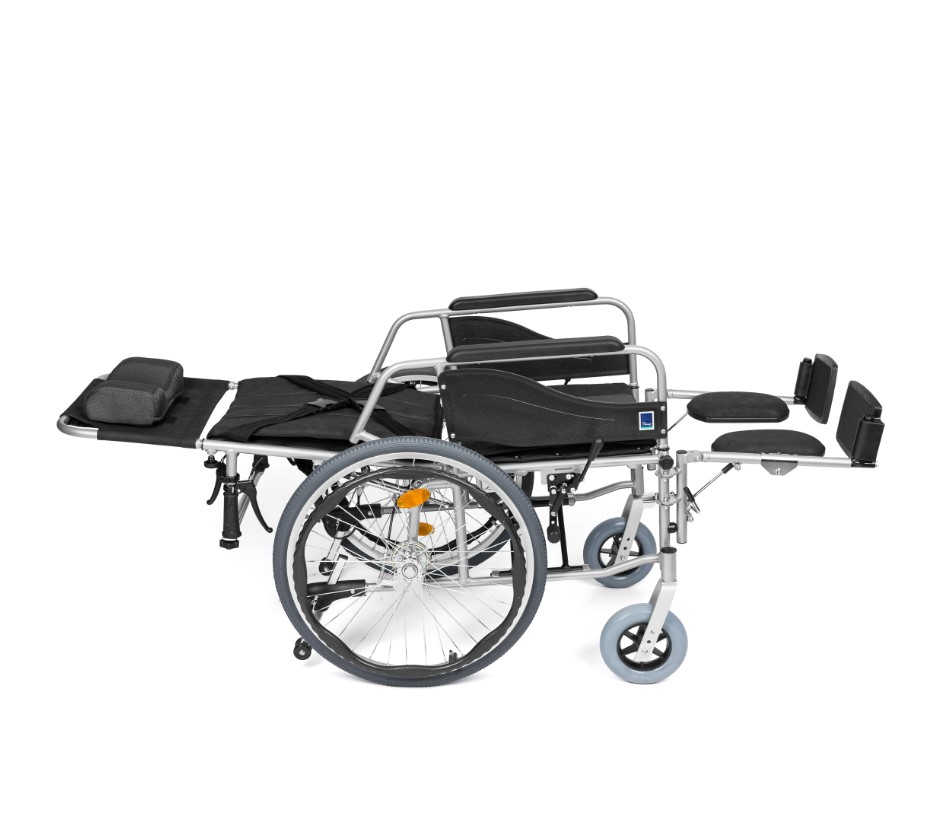 MOŻLIWOŚĆ REGULACJI – Wózek posiada przedłużone oparcie z funkcją regulacji kąta nachylenia od 0° do 90° co pozwala na przebywanie pacjenta w pozycji leżącej i półleżącej ułatwiając odpoczynek, czynności pielęgnacyjne oraz niwelując napięcie mięśni.